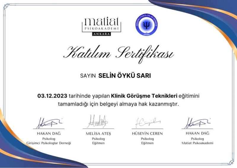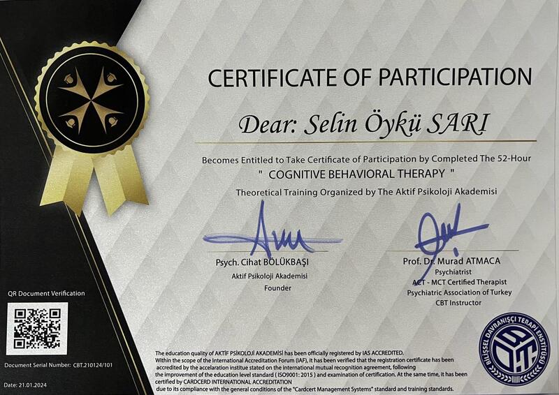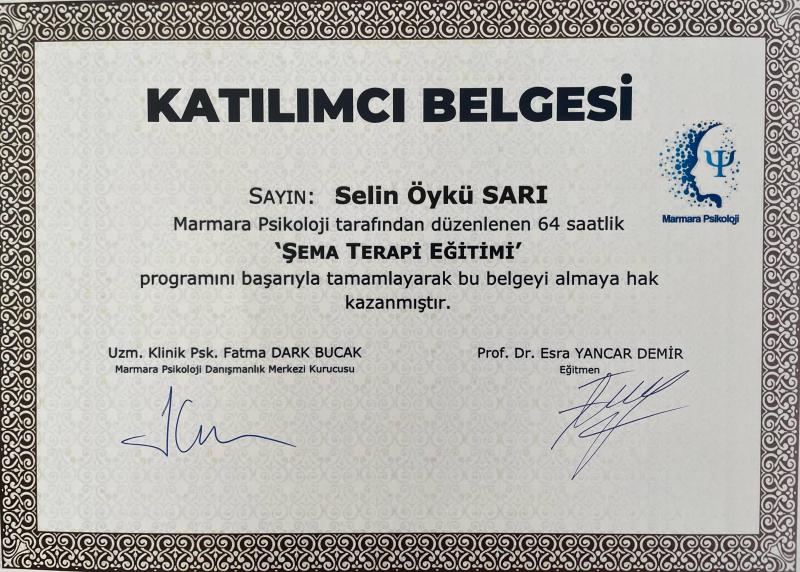 Şema Terapi, Klinik Görüşme Teknikleri ve Bilişsel Davranışçı Terapi (BDT) gibi alanlarda aldığım eğitimler ve sertifikalarla danışanlarıma en etkili yöntemleri sunmayı hedefliyorum. Araştırma, ekip çalışması ve psikolojiye olan ilgimle kendimi sürekli geliştirerek en güncel ve bilimsel yaklaşımlarla ilerliyorum.